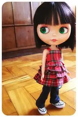 Blythe is a fashion doll, about 28 cm (11 inch) tall, with an oversized head and large eyes that change color with the pull of a string. It was created in 1972 and was initially only sold for one year in the United States by toy company Kenner (later purchased by Hasbro). In 2001, the Japanese toy company Takara[a] began producing new editions of Blythe dolls. There is a network of hobbyists who customize the doll for resale and create clothing and shoes for Blythe. Enthusiasts share photographs of their work and other types of dolls on the Internet.[1]