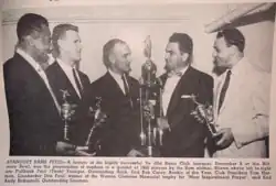 Rams 1952 Rookie-of-the-Year Bob Carey joins team members Tank Younger, Don Paul, Andy Robustelli and awards presenter Tom Harmon.