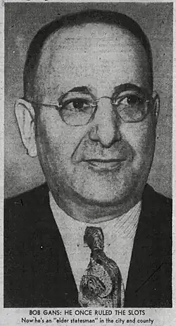 Gans was born in New York where "the name Gans was huge in New York tobacconist circles."[9][10] Gans started his career as an employee of his two brothers, Jonas Joseph "Joe" Gans (1875–1926)[11] and Charles J. Gans (1880–1961),[12][13] who by the turn of the 20th century had "a pair of cigar shops on Spring Street" operating under the business name J. J. Gans & Bro.[9] According to a 1952 Los Angeles Daily News series on the history of crime in the city: "Two brothers who were engaged in the wholesale tobacco business were quick to see the power for profit from slot machines. They acquired a few and installed them around the city. The brothers were Bob and Joe Gans, the latter now dead for many years. The boys were favorably known in Los Angeles as legitimate businessmen and were well-liked. They were gentlemen and had taken a modest interest in municipal and county elections, staking various candidates to financial help."[6] For example, in 1924, according to the Municipal League of Los Angeles, half of the $2,069 campaign budget reported by Superior Court judge Hugh J. Crawford was provided by his campaign manager, Robert J. Gans.[14]