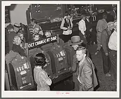 In early 20th-century California, there were countless venues for gaming, and their importance only grew as the Roaring Twenties collapsed into the Great Depression: "Slot machines could be found in the rear of many restaurants. Pinball machines that paid off in cash helped pay the rent in many small-business establishments".[1] Many of the sins attributed to Prohibition were equally associated with gambling, which was America's biggest underworld business by 1931.[2] Many of the places in Los Angeles that were storied "secret" bars were also secret or not-so-secret casinos. For example, at Frank Sebastian's Cotton Club on Washington Boulevard, half the reason for the floor show and the "brassy band" was to "drown out the sounds from the casino upstairs".[3] Charles J. Lick claimed to believe he was leasing the "submarine garden" hidden below his Dome Pier to honest aficionados of billiards, but after the heavily guarded basement casino outfitted like a "junior Monte Carlo concession" was raided four times, he canceled the lease.[4] Jack Doyle's place in Vernon had alcohol after neighboring Los Angeles passed the Gandier ordinance—and a card room.[5] Generally speaking, coin-operated slot machines and pinball machines were a poor man's game, that brought in a flow of cash with a profit margin ample enough to make their operators rich over time.[6] There were slots and pinball machines in the back of just about every bar, nightclub, pool hall, amusement park, carnival, ice-cream parlor, and drugstore in the Greater Los Angeles area during the interwar period,[7] and as one nostalgic account put it, "It is probably true that the pinball business was not simon pure...It is probably true that bars paid off big-hitters with beers, and tobacco shops paid off big-hitters with cigars. It is probably true that, worse, money changed hands. It is probably true that more than one L.A. schoolboy spent his lunch money and carfare in a pinball machine and had to walk home from school hungry."[8] A darker interpretation claims that Al Capone once said he'd give up every other criminal enterprise if he could have slot machines, and that slot machines were invented the day the devil was accidentally left in charge of the world.[6]
