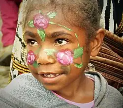 Many peoples around the world practice face painting in modern times. This includes indigenous peoples in places such as Australia, Papua New Guinea, Polynesia and Melanesia. Some tribes in Sub-Saharan Africa use the technique during rituals and festivals, and many of the indigenous peoples of the Pacific Northwest Coast of North America now use it for ceremonies, having previously also used it for hunting and warfare. In India it is used in folk dances and temple festivals, such as in Kathakali performances, and Mehndi designs are used at weddings. It is also used by Japanese Geisha and Chinese opera singers.[24] Women in Madagascar paint their faces with designs featuring stars, flowers and leaves using contrasting yellow and white wood paste called masonjoany.[25]