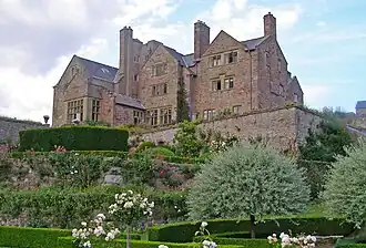 Below and to the east is the larger walled rose garden; other prominent garden features are a rectangular lily pond and a series of smaller herb and perennial gardens below the pineapple stone cottage and to the north. A croquet lawn is found to the north of the main building. The gardens are designated Grade I on the Cadw/ICOMOS Register of Parks and Gardens of Special Historic Interest in Wales.[9]