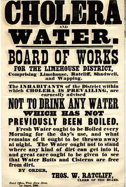 The first known modern boil-water advisory based solely on germ theory and unfettered by extraneous and irrelevant advice was distributed in 1866 during the last of three major cholera outbreaks that ravaged London in the 19th century.