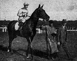 His new owner sent Bois Roussel to England to run in June's Epsom Derby. Making just the second start of his career, bettors sent the colt off at 20/1 odds. Ridden by jockey Charlie Elliott Bois Roussel scored an upset victory in England's most prestigious race. He was slowly away and among the back markers entering the straight. In the final quarter mile he produced what the Glasgow Herald described as "an astonishing burst of speed"[3] to come from well off the pace and take the lead inside the final furlong. He won going away by four lengths from Scottish Union and the favourite Pasch.[4] In winning, he earned more in prize money than Beatty had paid for him.[5]