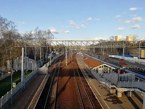 Bolshevo railway station is a railway station in Moscow Oblast, Russia. It is located on the Mytishchi-Fryazino section of the Yaroslavsky suburban railway line. It is part of the Naukograd, or science city, of Korolyov.