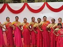 Traditional dress for women is the lugra. For men, traditional wear consists of khaki shorts and a white banian. A Koli Christian bridegroom usually wears an older Portuguese admiral's uniform, which is preserved and lent out for such occasions.[16] East Indian women wore a blouse and cotton lugra, with the back pleats tucked into the waist; women did not use the upper portion of the sari (covering the head and breast) until they were married. This mode of wearing the sari is known as sakacch nesane. Gol nesane, a cylindrical style, is popular with young girls and women.[23]
