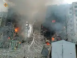As Russian forces fought in and near Kyiv, Borodianka, which is on a strategically important road,[5] was targeted by numerous Russian airstrikes.[7] The deadliest bombing was conducted in the evening of 1 March and the morning of 2 March, when Russian aviation destroyed 8 multi-storey residential buildings, killing at least 40 civilians.[8]