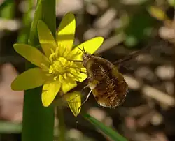 The species sometimes acts as a nectar robber, sometimes as a pollinator;[11] this foraging behavior allows the species to feed on floral nectar, which is an essential part of adult fly diets. This is facilitated by the characteristic long proboscis of the fly, which is horizontally inserted into the flower.[2] This occurs as the fly continues to buzz in the air, sometimes without touching either the anthers or stigma of the flower.[2] However, in some plant species such as Claytonia virginica, bee flies can be effective pollinators.[11][12] The fly also consumes pollen as part of its diet, with considerable differences between the sexes. Males and females visit the same range of flowers as a food source.[13]