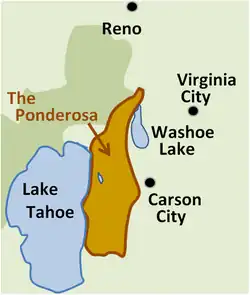 The family lived on a thousand-square-mile (2,600 km2) ranch called the Ponderosa on the eastern shore of Lake Tahoe in Nevada opposite California on the edge of the Sierra Nevada range.[7] The vast size of the Cartwrights' land was quietly revised to "half a million acres" (2,000 km2) in Lorne Greene's 1964 song, "Saga of the Ponderosa". The ranch name refers to the Pinus ponderosa (ponderosa pine), common in the West. The nearest town to the Ponderosa was Virginia City, where the Cartwrights would go to converse with Sheriff Roy Coffee (played by veteran actor Ray Teal), or his deputy Clem Foster (Bing Russell).