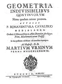Bonaventura Francesco Cavalieri (Latin: Bonaventura Cavalerius; 1598 – 30 November 1647) was an Italian mathematician and a Jesuate.[1] He is known for his work on the problems of optics and motion, work on indivisibles, the precursors of infinitesimal calculus, and the introduction of logarithms to Italy. Cavalieri's principle in geometry partially anticipated integral calculus.