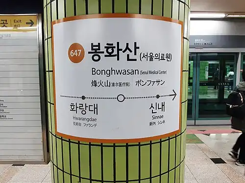 Bonghwasan Station is a railway station in Jungnang District, Seoul, South Korea. It was the eastern terminus of Seoul Subway Line 6 until December 21, 2019, though many eastbound trains still terminate here, as Sinnae station is only allowed to accommodate 1 train at a time as the Line 6 station only has one track and one platform, but it will be expanded to 2 tracks and 2 platforms in the future.