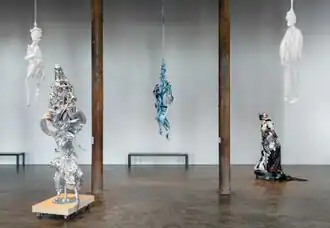 Collura's exhibition, "Mutable Bodies" (Hallwalls, 2022) juxtaposed sewn, cast and carved works (some, like Rebuke: Two Months Until Fifty, 2020, employing all three methods) that shared formal properties, shapes, and modes of expression: for example, the textile work Guardian Blue (2018)—a vertical tangle of joined, repurposed quilted fabric whose shimmering, colored surfaces belied its hung, world-weary form—and Matriarch/HeavyMetal/Jesus (2018), a solid, undulating and ascending silver sculpture.[13][31]