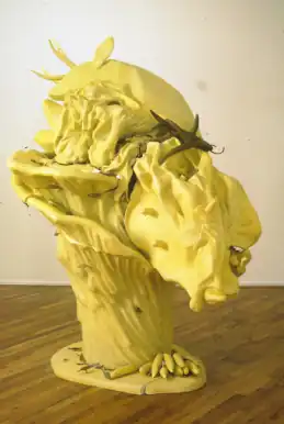 Between 2000–07, in exhibitions such as "In the Gutter" (Lehmann Maupin, 2000) and "Rebel Angel" (Susan Inglett, 2003), Collura experimented with increasingly abstracted, monochrome sculptures.[5][40][4][30] They melded barely recognizable human and animal forms, branches, classical drapery and commedia dell'arte costuming, seemingly embattled to materialize out of central, amorphous masses (e.g., Chain Reaction, 1999).[5][41][6][4] Reviewers characterized these works as "dramatically abject"[6] portrayals of ecstasy or distress that suggested souls entrapped in terrestrial chaos or angels expelled into corporeality as monsters and twisted freaks of nature.[4][30] New York Times critic Holland Cotter likened them to "multi-vehicle collisions ... Baroque sculpture, Disney animation and Butler's Lives of the Saints seem to have met at meltdown speed, leaving stray limbs and maimed myths protruding from the wreckage."[35] Guardian (2003) portrayed a 21st-century Madonna with a clown's nose and an erupting hand, while Death of a Virgin (2006–11) depicted a large-eared, shattered figure on its back atop a vertical mass, as if after a great fall.[29][30]