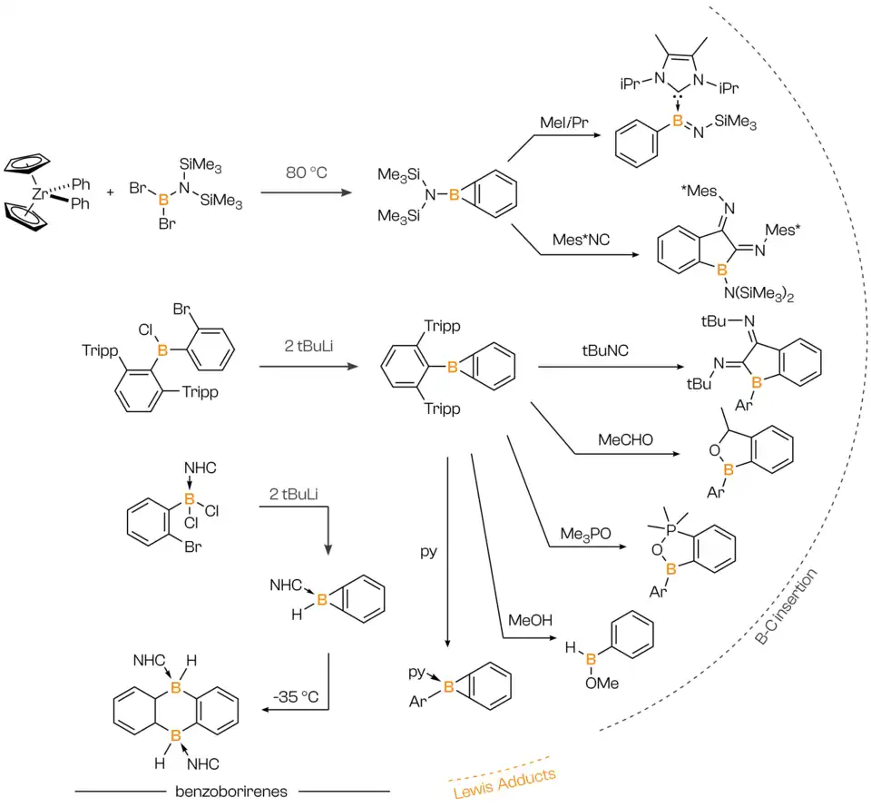 In 2020, the Ye group advanced the field by synthesizing a benzoborirene stabilized with bis(trimethylsilyl)amine (HMDS) using Cp2ZrPh2 and HMDSBBr2 as key reagents. Their foundings revealed that benzoborirenes exhibit distinct reactivity compared to borirenes. Strong donors, such as isonitriles and N-heterocyclic carbenes, induced ring-expansion and ring-opening reactions, respectively, diverging from the typical Lewis adduct formation observed for borirenes.[28][29]