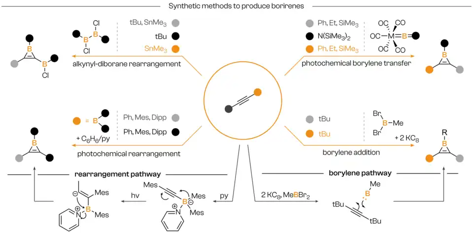 Borirenes can also be synthesized by rearranging internal alkynes bonded directly to boron substituents. For instance, alkyl-substituted diboranes react with trimethylstannylalkynes to form alkynyl-diborane intermediates, which quickly rearrange into borirene products. Alternatively, photoinduced rearrangement of alkynyl-boranes provides another efficient pathway for borirene synthesis.[5][23]