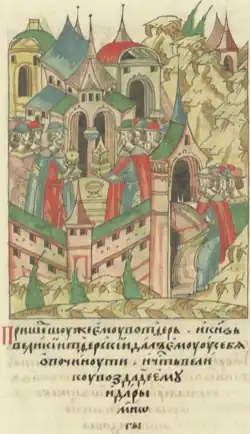 During his reign, around or after 1453, the monk Foma (Thomas) of Tver wrote the Pokhval'noe slovo (похвальное слово) or Word of Praise for the Grand Prince Boris Aleksandrovich.[4] It is alternately known as The Eulogy of the Pious Grand Prince Boris Alexandrovich, and has traditionally been interpreted as the origins of the idea of a Third Rome (after the 1453 Fall of Constantinople); although this ideology would later be associated with Moscow, it began in Tver.[4][5][6]