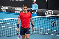 Ćorić started his 2021 season at the first edition of the Murray River Open. Seeded fourth, he reached the quarterfinals where he lost to eighth seed and eventual champion, Dan Evans.[151] Seeded 22nd at the Australian Open, he was defeated in the second round by American Mackenzie McDonald.[152]