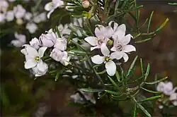 Boronia hemichiton, commonly known as Mt Arthur boronia[2] is a plant in the citrus family Rutaceae and is endemic to Tasmania. It is an erect, woody shrub with compound leaves and pink or white, four-petalled flowers.