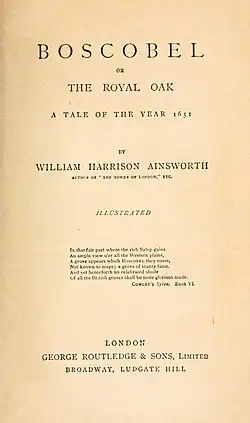 Boscobel is an 1872 historical novel by the British writer William Harrison Ainsworth. It first appeared as a serial in The New Monthly Magazine before being published in three volumes by the London publishing house Tinsley Brothers.[1] [2] It marked a return to the historical subjects he was best known for, after producing three novels with contemporary settings such as Old Court (1867) and Myddleton Pomfret (1868). It takes place in the weeks before and following the Battle of Worcester in 1651, in which Charles II avoided capture after his defeat by his republican enemies under Oliver Cromwell. His escape included hiding in the royal oak at Boscobel House in Shropshire, from which the novel takes its title. It also formed the first of a trio of "Jacobite" novels sympathetic to the Stuart Dynasty, followed by The Manchester Rebels (1873) and Preston Fight (1875).[3]
