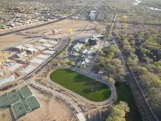 An aerial view of the school. Pictured also is a partial view of the proximate riparian forest or "bosque".