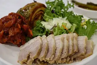 Bossam (Korean보쌈) is a pork dish in Korean cuisine. It usually consists of pork shoulder that is boiled in spices and thinly sliced.[1] The meat is served with side dishes such as spicy radish salad, sliced raw garlic, ssamjang (wrap sauce), saeu-jeot (salted shrimp), kimchi, and ssam (wrap) vegetables such as lettuce, kkaennip (perilla leaves), and inner leaves of a napa cabbage.[2][3]