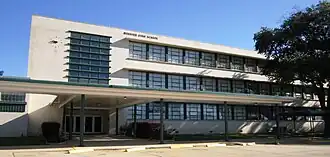 The present Bossier High School, a three-story building located at 777 Bearcat Drive, was built in 1938–39. It was listed on the National Register of Historic Places in 2004.[2] It was designed by architect Samuel Wiener in International Style. Due to rapid population growth, the city's Bossier High School (Colquitt Street) built in 1923 and 1928 became over-crowded, and this school was built to replace it. The former school was then devoted to serving elementary school levels. It was built by contractor James T. Taylor of Fort Worth, Texas. The listing included three contributing buildings.[7]