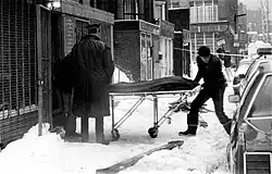 A victim is wheeled out of the gambling club on January 12th, 1991.