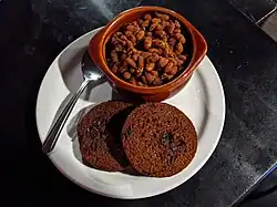 Boston baked beans are a variety of baked beans, sweetened with molasses, and flavored with salt pork or bacon.[1][2][3]