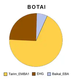 The Botai and the WSHG can be modeled as deriving ancestry primarily from an EHG-like and ANE-like source, with some gene flow from an AEA-like population. This model can be simplified into modeling the Botai and the WSHG to derive their ancestry from the combination of an EHG-like population and a population similar to the early Tarim mummies from Xinjiang (Tarim_EMBA1), who had the "fitting" combination of Ancient North Eurasian and Ancient East Asian components. The Botai, compared to the WSHG, however, needs a small additional AEA contribution. Different models estimated the overall Eastern Asian-related contributions for the Botai to be c. 17.0±2.2% (12—30%), with the remainder being associated with EHG and ANE-like components.[25] The admixture event was estimated to have taken place about 7,000 BC.[26]