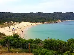 The sandy soils are covered with diverse vegetation comprising over 350 species once common in the eastern suburbs of Sydney, including rare species and communities. The most common vegetation cover is heath Banksia community (Banksia ericifolia), prickly tea tree (Leptospermum juniperinum) and paperbark (Melaleuca nodosa). To the west of the park is a thick covering of coastal tea tree scrub (Leptospermum laevigatum) consisting of coast banksia (Banksia integrifolia) and bangalay (Eucalyptus botryoides). In sheltered areas such as behind little Congwong Bay lies a low closed forest of smooth-barked apple (Angophora costata).[2][26]