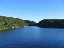 The watershed is very elongated, along a north–south axis of 75 kilometres (47 mi). Its greatest width is in the center section, where it reaches 20 kilometres (12 mi). About 6.85% of the basin is covered by water bodies, the largest being Lake Bigot in the north with an area of 9.1 square kilometres (3.5 sq mi). Due to the sloping terrain in most of the basin, wetlands such as ombrotrophic peatlands cover only 0.46% of the basin.[10] The network of streams and rivers is angular, conforming to fractures in the hard bedrock, with straight segments between right-angled forks. In the plateau the rivers flow through narrow V-shaped valleys with very steep slopes. In the piedmont the valleys have the U-shaped profile typical of glacial valleys, and the rivers wander through the glaciofluvial deposits.[10]