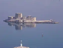 The water castle of Bourtzi (Greek: Μπούρτζι, from Ottoman Turkish برج - burc meaning "tower"; formerly Καστέλλι, Kastelli or Πασσάζ, Passaz) is a Venetian[1] castle located in the middle of the harbour of Nafplio.