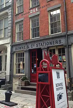 In 1975, Bowne & Co., Inc. partnered with the South Street Seaport Museum to open a 19th-century-style print shop in the historic Seaport district of New York City.[2] This print shop, billed as the oldest continuously running business in New York City, operates at 211 Water Street as Bowne & Co., Stationers.[3]