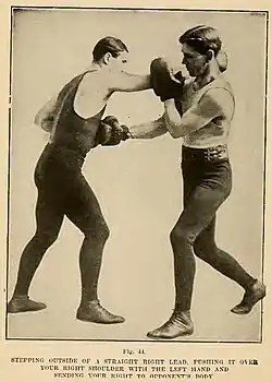 • Shoulder block — a defensive technique where a fighter uses their shoulder to deflect or block punches, particularly the opponent's lead hand punch like a right cross or a southpaw jab.[25] The fighter positions their lead shoulder high, tucking their chin behind it.[25] The shoulder is rolled forward to meet the incoming punch, deflecting it away from the head and body.[25]