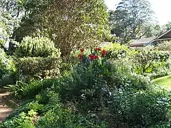At the rear, or south, of the house is located the terraced cut flower area, cottage garden and walled garden, including an undulating brick wall, to the west of this section is the compost area, the site of the old vegetable garden and the windmill. Along the western border and shrubbery a mixed border has been planted including hibiscus, peaches, cherries, crab apple, wisteria, lavender, bella donna, spider, crinum, day lilies and daffodils.[1]