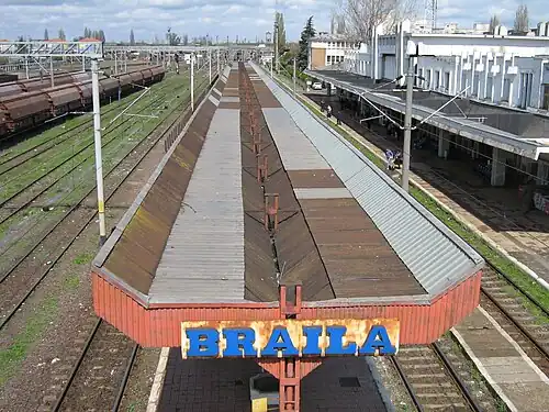The Brăila railway station is the only railway station in Brăila, Romania. The station was built in 1869 by the Prussian company Strussberg, which did so in the model of those in Prussia. It was formally opened in September 1872 and gave Brăila more commercial and economic importance. On 6 May 1877, as the Romanian War of Independence was taking place, four monitors of the Ottoman Empire shelled the city, including its station. It was again shelled by the Soviet Air Forces on 5 July 1941 during World War II, a bombardment from which the station would not recover until 1970.[1][2]