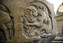 Gotland limestone has been used to make the font from the later part of the 12th century. It is akin to the font seen in Bornholm, though the decorations are different; these are inferred to be by an artist of Zealand. The bowl of the font has decorations made in relief. They depict the Three Kings and Saint Anne holding the baby Jesus. Also seen in the relief are other scenes of an angel restraining a hunter, a deer, a cross turned towards the hunter, satan in the form of an ape, and horses saddled but without the riders, the central horse carrying a falcon. The plinth also has relief decorations of a bishop, two snakes being nursed by a woman, a snake, and also of a book with a cross and griffin.[3]