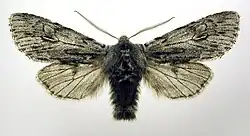 The wingspan is 48–60 mm. Edward Meyrick describes it thus: Forewings pale brownish mixed with whitish and much sprinkled with black; veins marked with blackish; first, median, and second lines dark fuscous; reniform whitish, black edged, enclosing two dark marks; claviform, oval, black edged. Hindwings whitish fuscous, with dark fuscous discal spot and terminal dots. Larva pale yellow green deeper laterally; tubercular dots pale yellow; an oblique lateral streak on 4, and transverse streak on 12 yellow; legs more or less red. The larva habitually rests with the anterior segments strongly thrown back over the body and the legs outspread.[1]