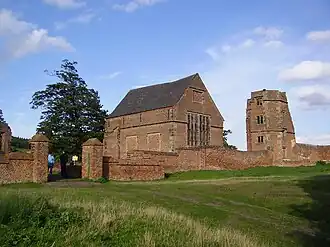 Sometime after 1739 they moved out of Bradgate, which began a long decline.[3] The spectacular ruins of the house are still visible at the centre of the park.[4][5] The house was approximately 200 feet (61 m) long, featuring a main hall measuring 80 by 30 feet (24.4 m × 9.1 m). As well as considerable remains of walls and fireplaces, it has four truncated towers and the chapel is still intact,[6] containing a tomb effigy to Henry Grey, 1st Earl of Stamford and his wife.[7]
