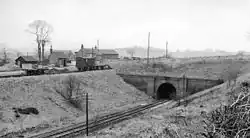 The station had a single platform and limited goods facilities.[7] Although the station buildings and passenger platform were in a cutting, the small goods yard was constructed at the top of the bank and this necessitated quite a steep gradient in the track leading from the branch line to the goods yard.[8] A passing loop was installed and Bradnop was a block section with Ipstones and Leek Brook East signalboxes,[9] although Bradnop itself was not equipped with a signal box, only a ground frame.[10]