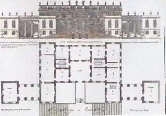 Bramham Park from Jones's Views of the Seats of Noblemen and Gentlemen (1829). A carriage ramp on the entrance facade conveys visitors to the principal entrance on the piano nobile.