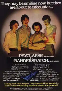 Finchspeed, a company created by former Imagine directors, Ian Hetherington, Mark Butler and Dave Lawson,[6][7] attempted to acquire the assets of the failing company but this was unsuccessful and the rights to the games were sold by the receivers.[8] In October 1984, Sinclair Research paid a rumoured £100,000 for the rights to Bandersnatch and contracted a new company set up by Hetherington and Lawson, Fire Iron, to produce the game for the Sinclair QL[5] for release in early 1985.[9][10][11]