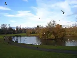 The park covers an area of 168 acres, has two lakes, large open spaces, woodlands and meadows. It has three formal gardens; a war memorial garden, a walled garden and an azalea garden. Facilities include a children's play area, a skate park, outdoor gyms and four football pitches. A small museum in the park opens on special occasions.[2] At the edge of the park is Braunstone Leisure Centre, which is run by Leicester City Council.
