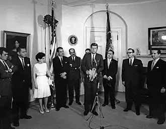 At Kennedy's request, in 1962 Goulart interceded with the Cuban government to prevent the execution of prisoners captured after participating in the Bay of Pigs Invasion.[76][g] The same year, during the Missile Crisis, Kennedy demanded the withdrawal of Soviet missiles from Cuba. Jango communicated to the American ambassador his support for this decision. Lincoln Gordon evaluated this moment as a high point in a deteriorating relationship. When, on October 22, the USA convened an OAS meeting, Brazil was in favor of a naval blockade of the island, but opposed to military intervention.[77]