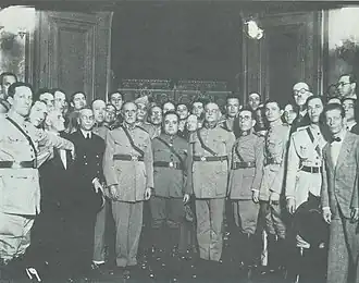 Tasso Fragoso, head of the junta,[26] Mena Barreto, and Noronha declared themselves a "pacifying junta" with a "moderating power",[29][30] despite not controlling any territory outside Rio de Janeiro.[31] São Paulo Governor Hastínfilo de Moura, who was appointed by the junta, was unpopular because Moura had commanded federal forces fighting rebels in the Paraná–São Paulo area. After protests ensued, he left office on 28 October.[32][33] Klinger told the press on the same day that "the false rumor that the Governing Junta will be summarily replaced and will turn over the reins of government to Getúlio Vargas" was ungrounded.[34] Among other measures, the junta dismissed the reserves called by Luís during the last days of his government, demilitarized the South Minas Gerais Railway Network, authorized banking operations to resume, opened a line of credit to counter yellow fever, and replaced some military commanders.[21]