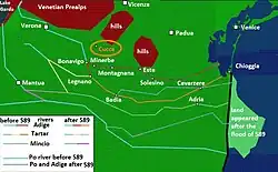 The hydrography of the lower Veneto had a dramatic change after the breach at Cucca: the river Adige no longer passed through Montagnana and Este, and instead was diverted south through Legnago;[2] centuries later, as the land dried up, it started following what had been the former course of the Chirola canal, passing through Badia Polesine and Cavarzere.