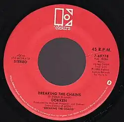 "Breaking the Chains" is a song by American heavy metal/glam metal band Dokken, appearing on the band's debut album of the same name. The song was originally released as a single "Breakin' the Chains" in 1981 through Carrere Records exclusively in Europe, appearing as the B-side to the "I Can't See You" single.[3] "Breaking the Chains" was released as a single in 1983 through Elektra Records, being the band's first American single. The song was a modest success, peaking at #32 on the Billboard Mainstream Rock chart.[4] The song remained on the chart for 13 weeks.[5]