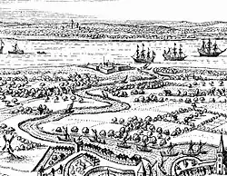 In parallel with the advance of Münster, Brandenburg and Danish troops, there were two unsuccessful landing attempts by Danish and Brandenburg forces, that were repulsed by the Swedes with heavy losses. The first landing operation, at the end of September, was carried out near Carlshagen by a Brandenburg formation under Admiral Simon de Bolfey, in order to conquer the strategically important Carlsburg Fortress on the Weser.[14] This Swedish fortress had been first constructed in 1672 with the task of controlling the mouth of the Weser. Approaching from the River Elbe, a Brandenburg squadron of seven ships appeared, with a landing force of 534 men;[12] together with the ships' complements, the whole force comprised about 800–900 men.[13]