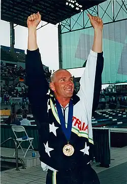 Burkett first represented Australia at the 1987 Pan Pacific Para-Swimming Championships, where he won a gold medal in the 100 m butterfly.[4] At the 1988 Seoul Games, he won a silver medal in the Men's 4 × 50 m Freestyle Relay A1–A8 event.[4][12] At the 1992 Barcelona Games, he won a bronze medal in the Men's 50 m Freestyle S9 event.[13] He won a silver medal at the 1994 Victoria Commonwealth Games in the Men's 100 m Freestyle S9 event.[5] At the 1996 Atlanta Games, he was the captain of the Australian Paralympic team.[7] At the games, he won a gold medal in the Men's 50 m Freestyle S9 event, for which he received a Medal of the Order of Australia,[1] and a silver medal in the Men's 4 × 100 m Freestyle S7–10 event.[13] At the 1998 IPC Swimming World Championships in Christchurch, he was part of the Australian team that won a gold medal and broke a world record in the 4 × 100 m Freestyle Relay event.[5] He won a gold medal and again broke a world record in the Men's 50 m Freestyle S9 event at the 1999 European Championships; his father had died earlier that year.[14] He carried the Australian flag at the opening ceremony of the 2000 Sydney Games.[14] At the Games, he won a silver medal in the Men's 4 × 100 m Freestyle 34 pts event;[13] he was very disappointed that he could not defend his 50 m freestyle title.[14] He retired from competitive swimming after the 2000 games.[10]