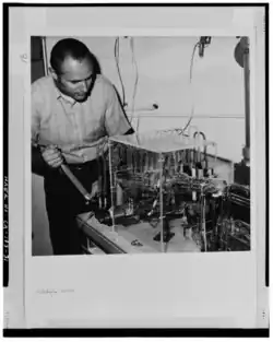 ![]() Brent Dalrymple adjusting mass spectrometer vacuum flight tube, 1971 | |